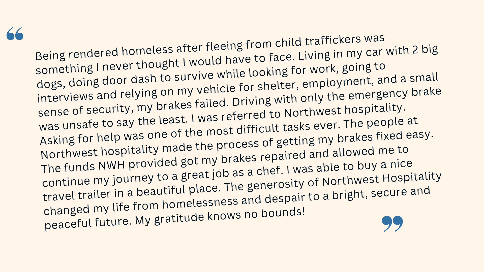Being rendered homeless after fleeing from child traffickers was something I never thought I would have to face. Living in my car with 2 big dogs, doing door dash to survive while looking for work, going to interviews and relying on my vehicle for shelter, employment, and a small sense of security, my brakes failed. Driving with only the emergency brake was unsafe to say the least. I was referred to Northwest hospitality. Asking for help was one of the most difficult tasks ever. The people at Northwest hospitality made the process of getting my brakes fixed easy. The funds NWH provided got my brakes repaired and allowed me to continue my journey to a great job as a chef. I was able to buy a nice travel trailer in a beautiful place. The generosity of Northwest Hospitality changed my life from homelessness and despair to a bright, secure and peaceful future. My gratitude knows no bounds!