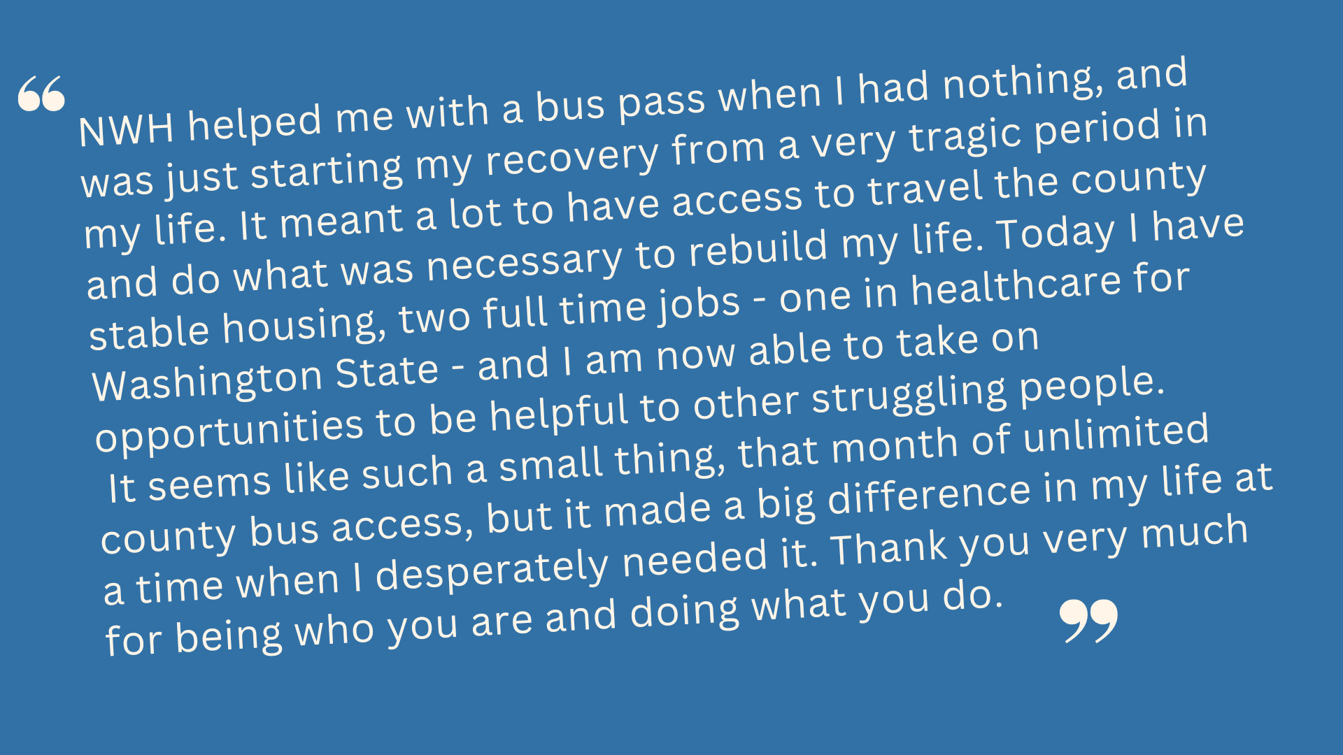 NWH helped me with a bus pass when I had nothing, and was just starting my recovery from a very tragic period in my life. It meant a lot to have access to travel the county and do what was necessary to rebuild my life. Today, I have stable housing, two full-time jobs - one in healthcare for Washington State - and I am now able to take on opportunities to be helpful to other struggling people. It seems like such a small thing, that month of unlimited county bus access, but it made a big difference in my life at a time when I desperately needed it. Thank you very much for being who you are and doing what you do.